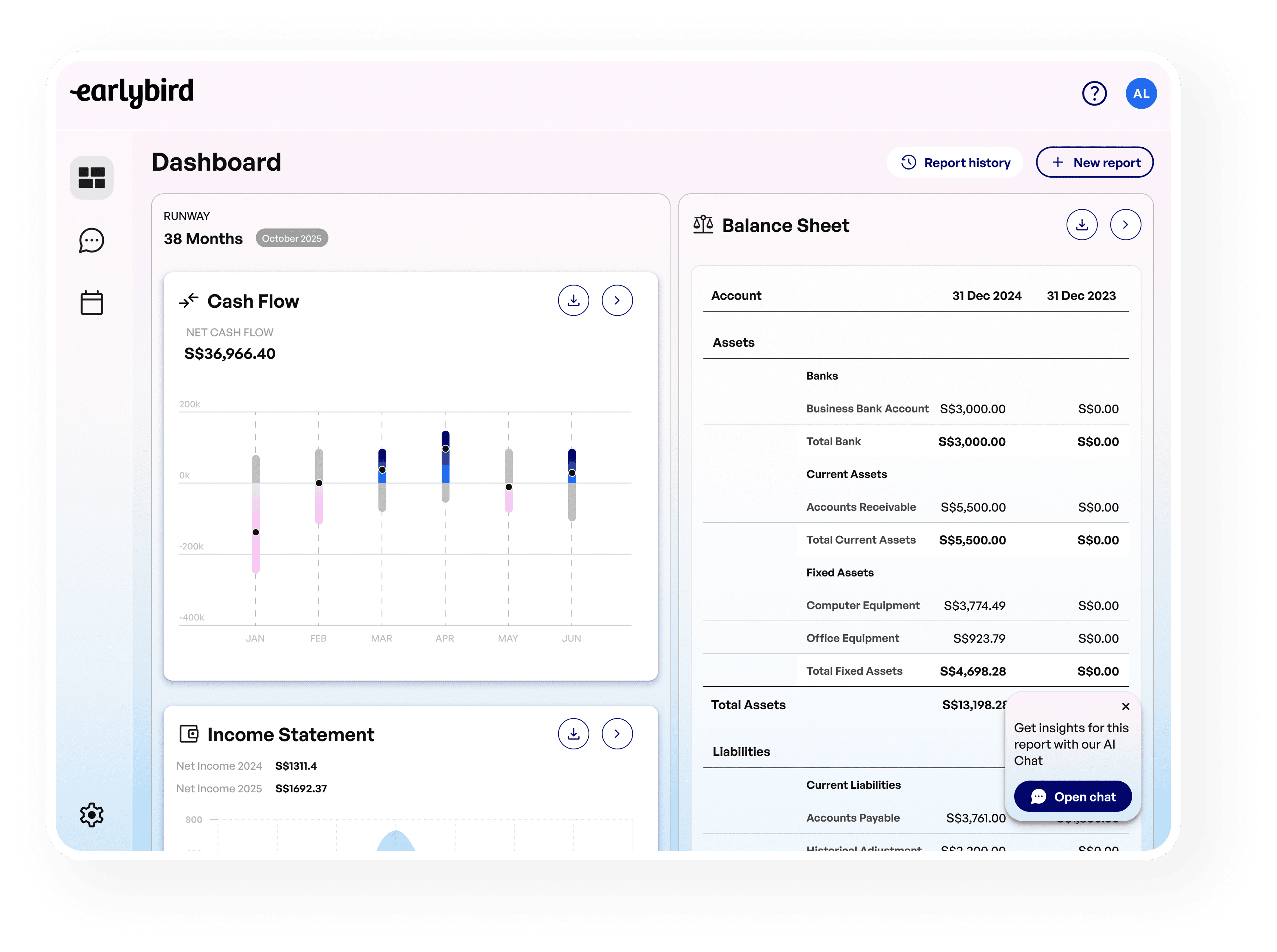 Analyse accounts, understand key metrics, and get financial insights at your fingertips 24/7, through your Financial Concierge and live AI generated financial statements.